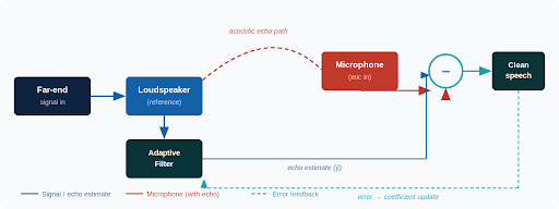 An Acoustic Echo Cancellation algorithm maintains an adaptive filter that models the acoustic path from the loudspeaker to the microphone. Using the loudspeaker signal as a reference, it estimates what portion of the microphone signal is echo, subtracts this estimate, and delivers clean near-end speech. The filter coefficients are updated at every sample using an algorithm such as NLMS, continuously tracking changes in the echo path.