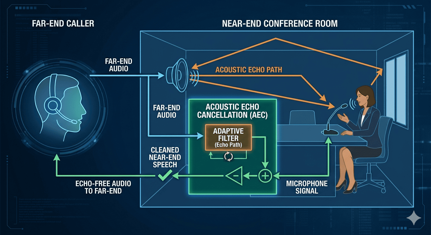 Acoustic Echo Cancellation (AEC) is a real-time signal processing technology that eliminates the echo produced when audio played through a loudspeaker is re-captured by a nearby microphone and transmitted back to the far-end caller. Without Acoustic Echo Cancellation, the remote party hears their own voice returning with a delay — a phenomenon that is both disruptive and cognitively fatiguing in any voice communication scenario.